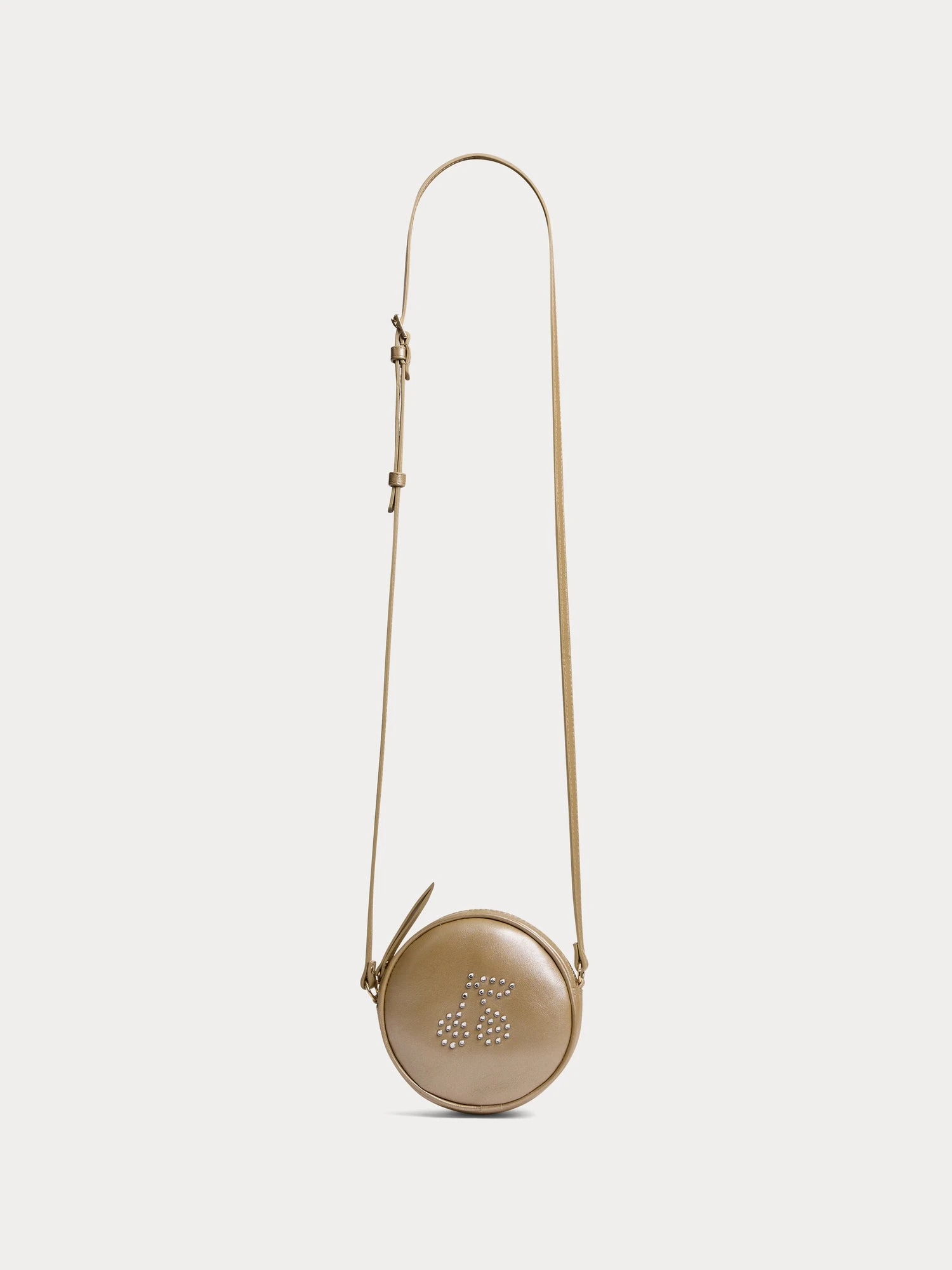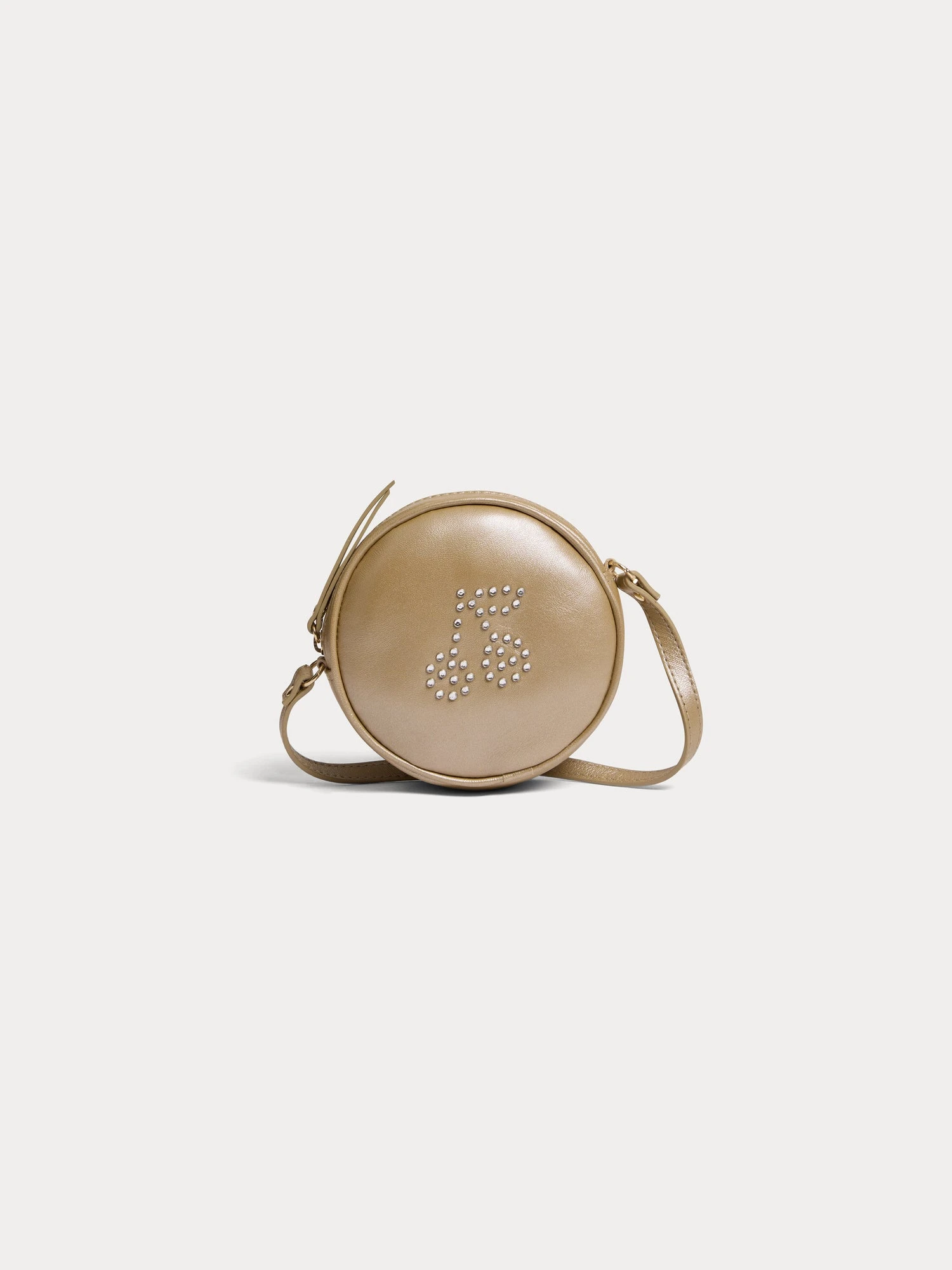 Le sac en cuir Gomette pour fille allie modernité et praticité avec sa forme ronde. Il est sublimé par un motif cerise réalisé en clous métalliques.