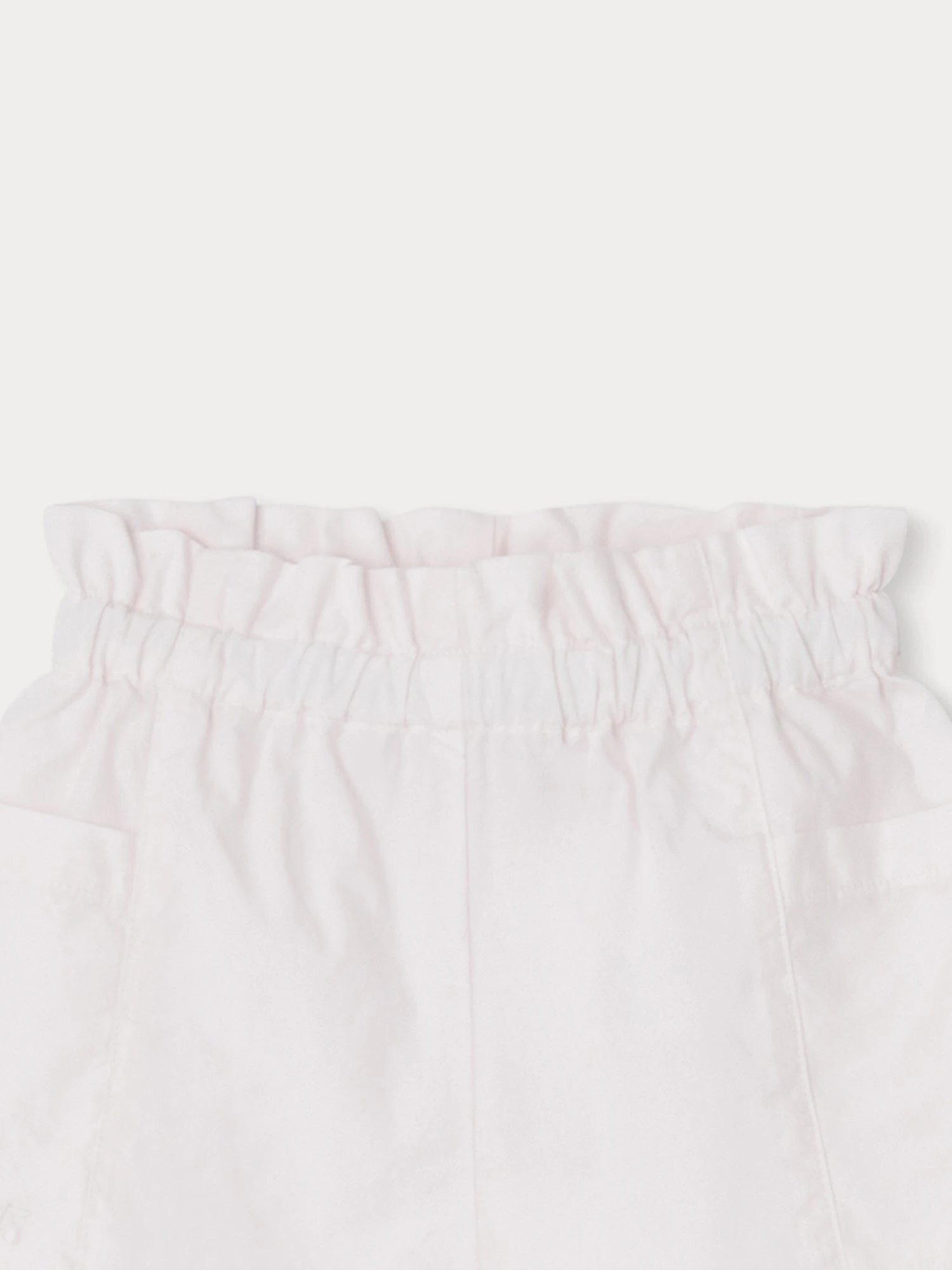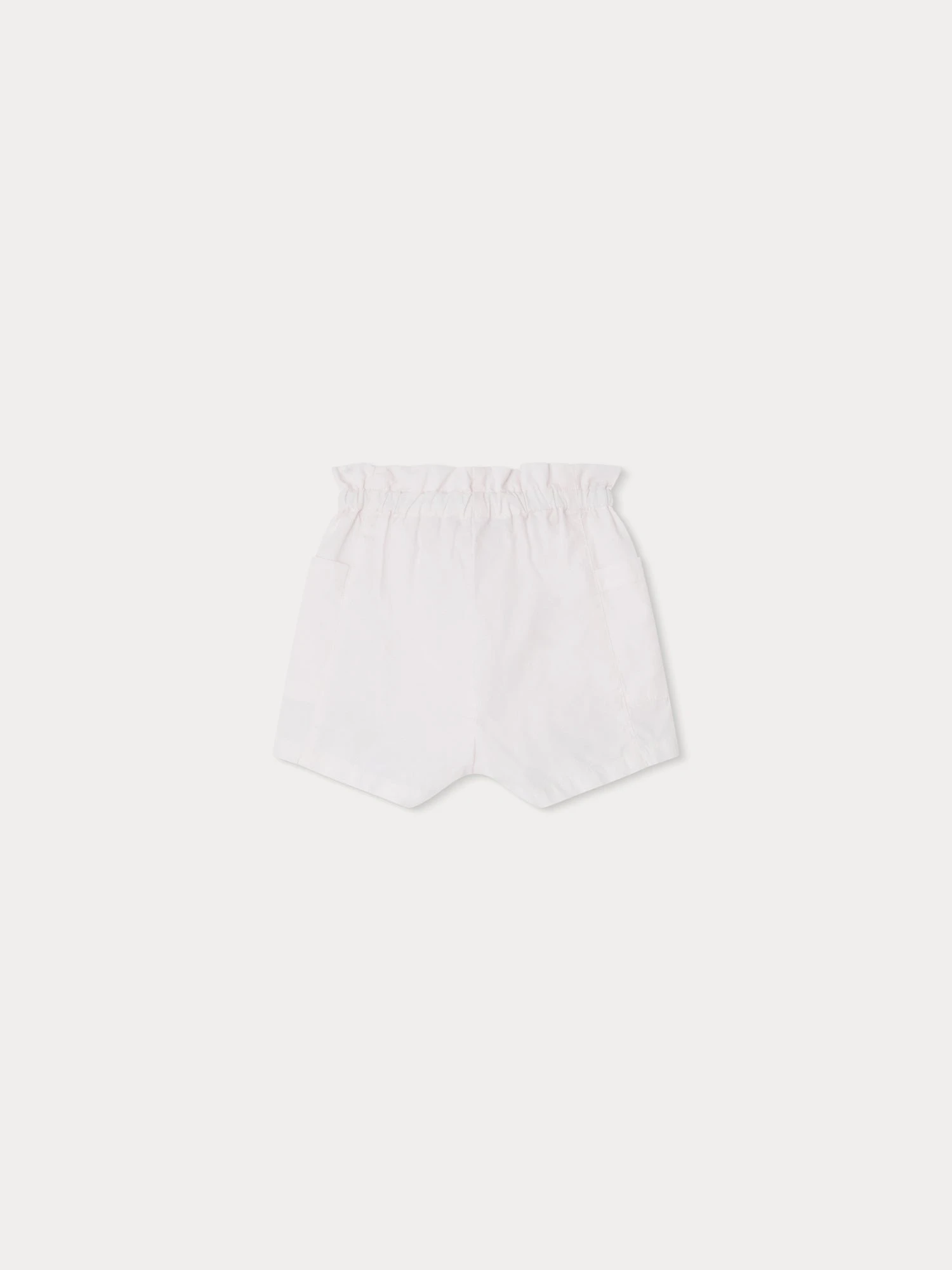 Le short Nougat pour bébé fille compose une tenue empreinte de délicatesse avec sa popeline surteinte et sa taille élastiquée à volants. Il possède deux poches plaquées sur les côtés.