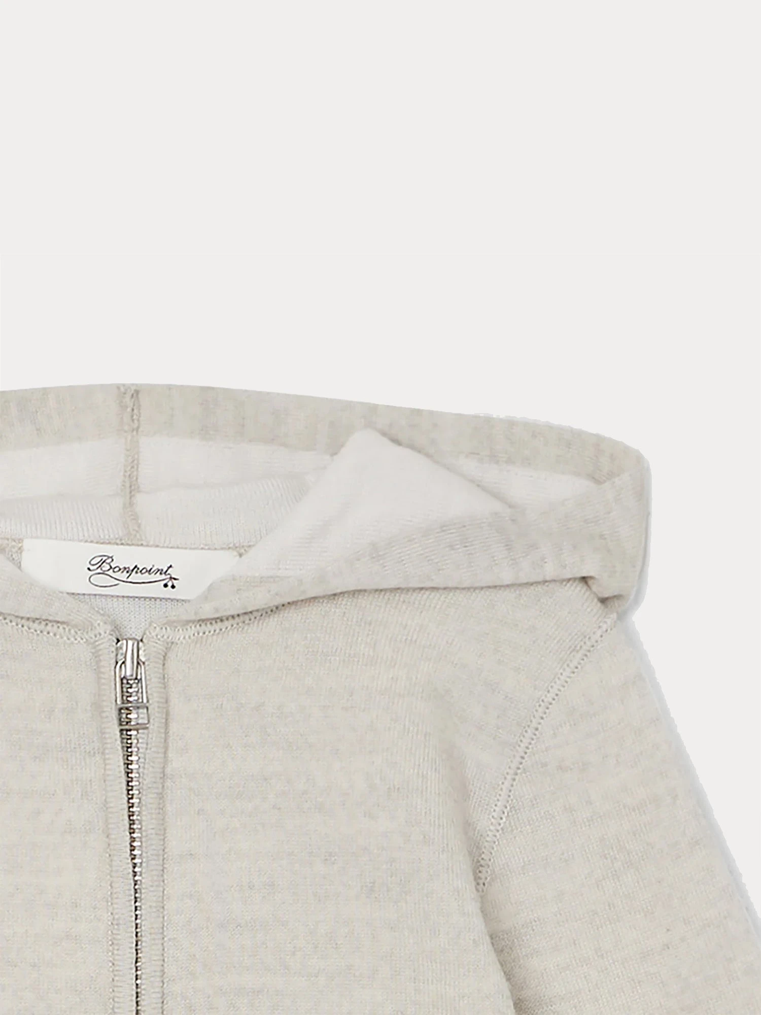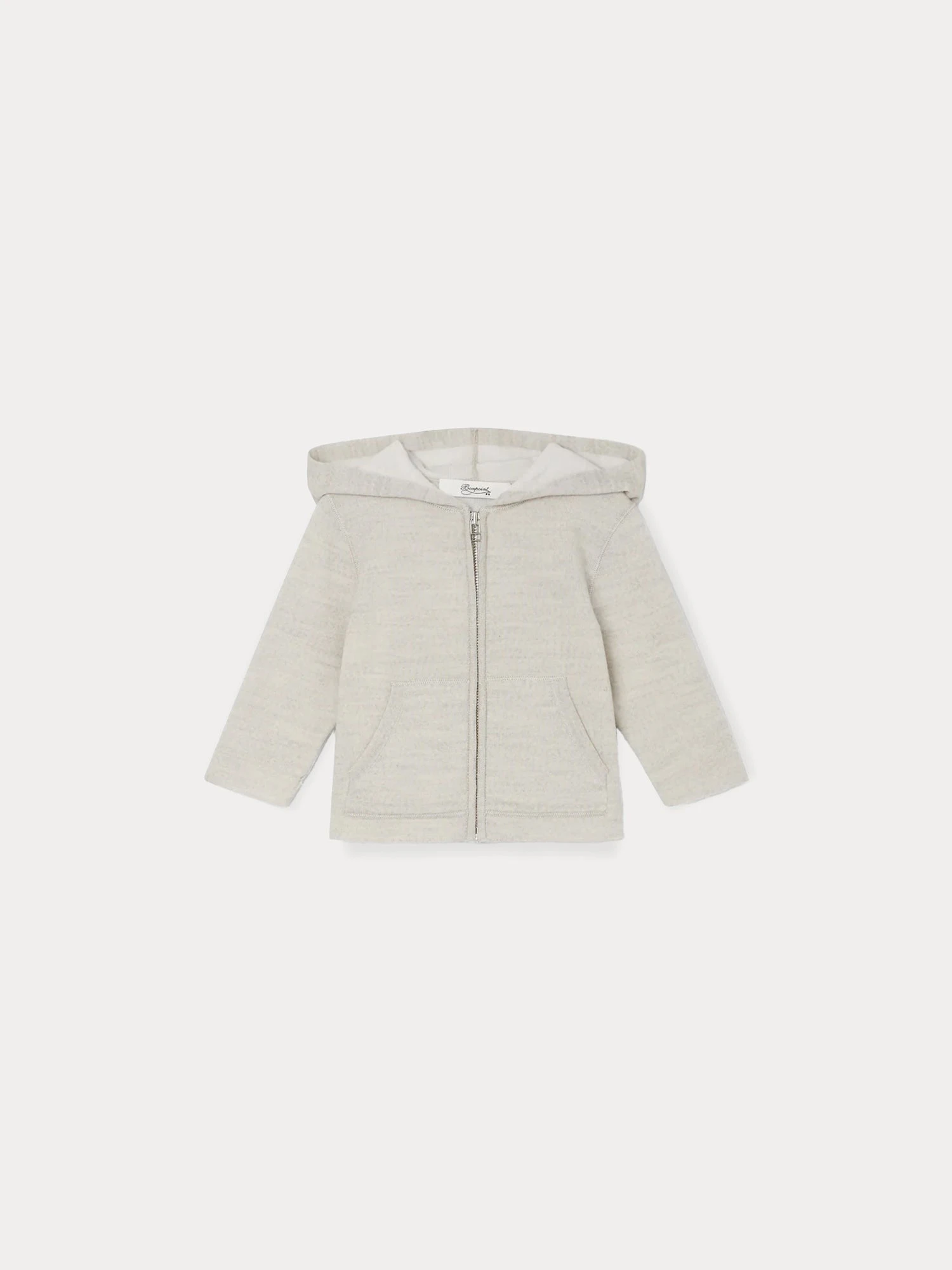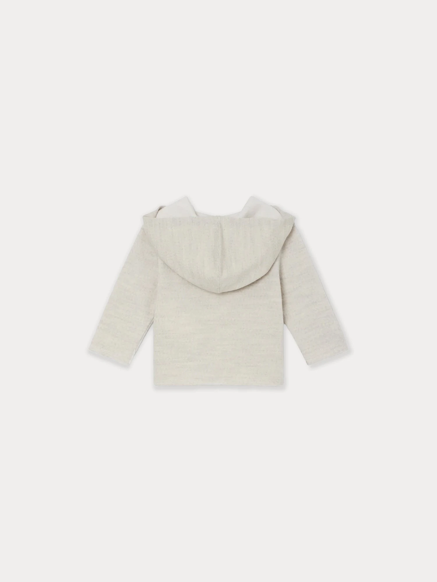 Le sweat-shirt Alexandros forme un écrin de douceur pour bébé avec sa maille mérinos à jauge fine. Ce modèle droit se complète d’une capuche.