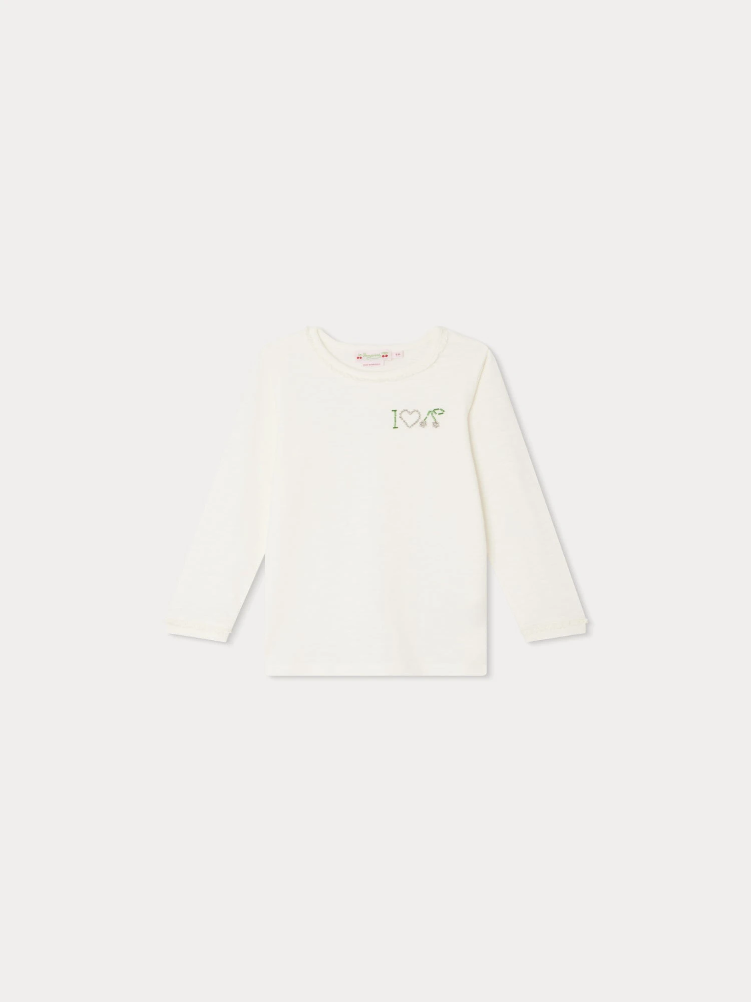 Le t-shirt Blanca pour fille se démarque par son message malicieux mariant cœur et cerise, brodé main en perles devant. Le col rond et les poignets se finissent par un effet frangé tendance.