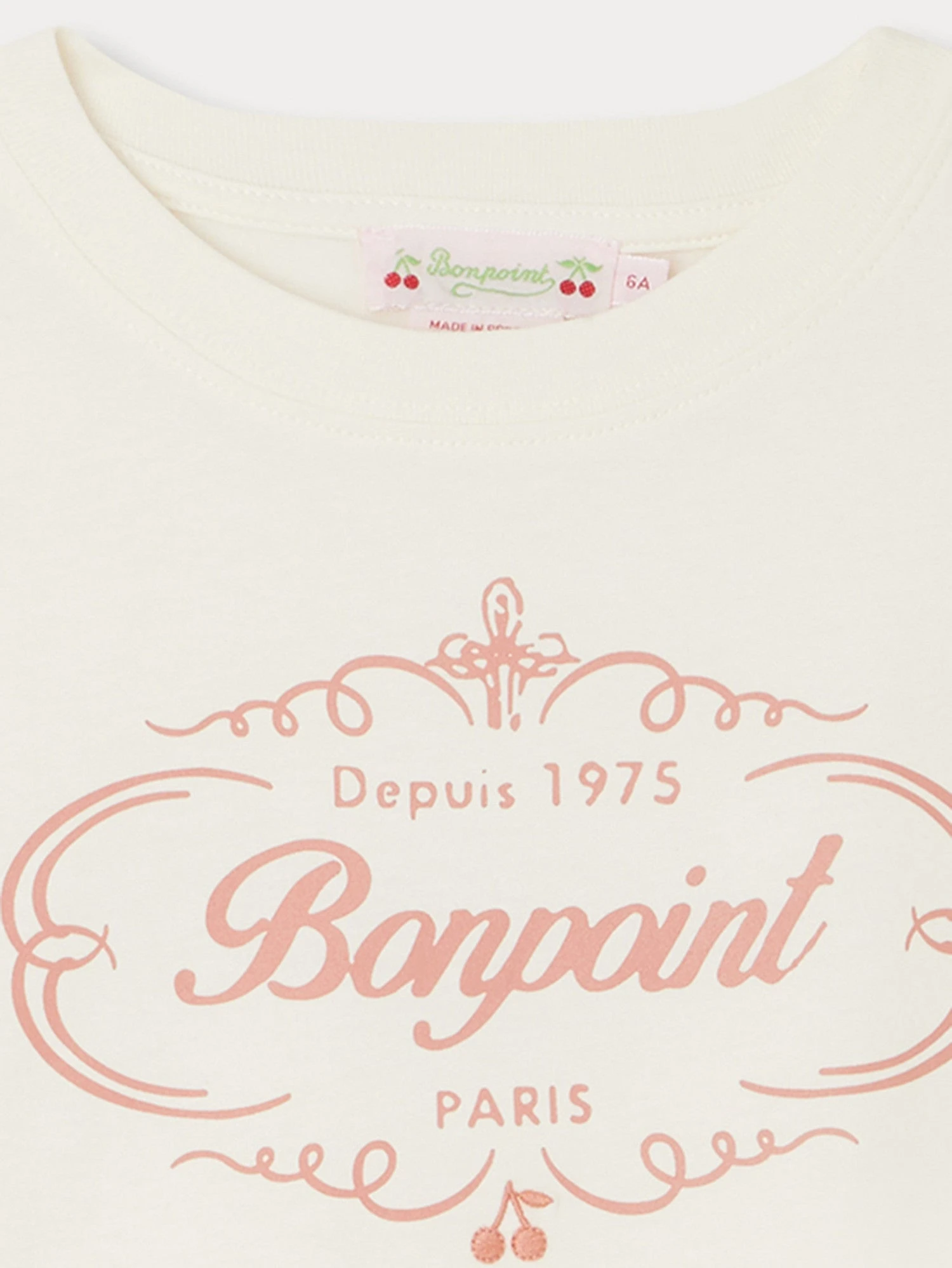 Le t-shirt Thida pour fille témoigne de l’engagement écoresponsable de la Maison avec son coton issu de l’agriculture biologique. Le blason Bonpoint est imprimé en contraste devant et souligné d’une cerise assortie.