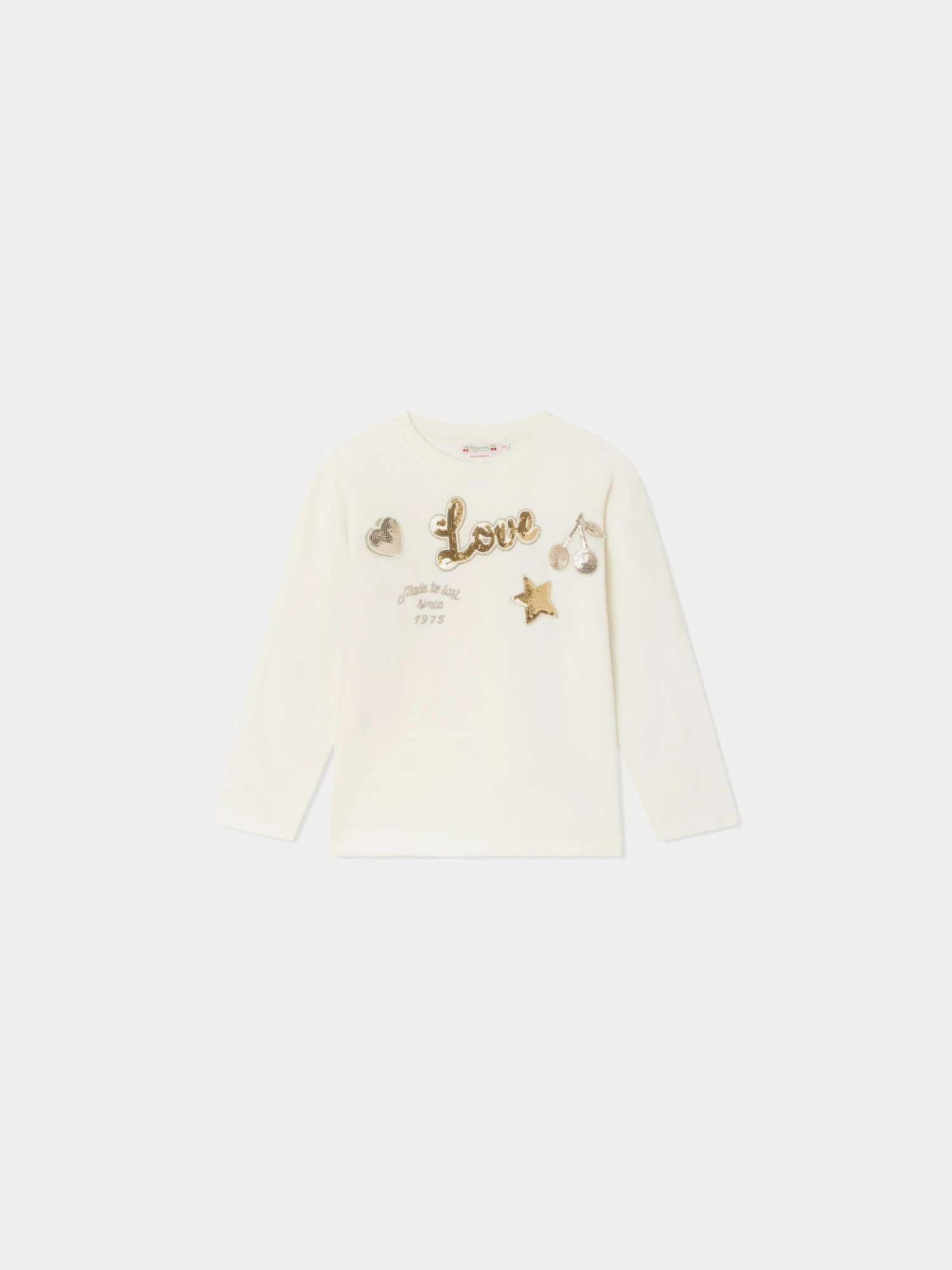 Le t-shirt Tien pour fille s’orne de plusieurs broderies et patchs à sequins sur l’avant : étoile, cœur, cerise… Ce modèle en jersey doux est conçu en coton issu de l’agriculture biologique.