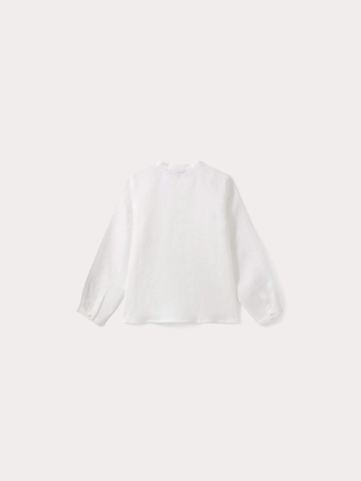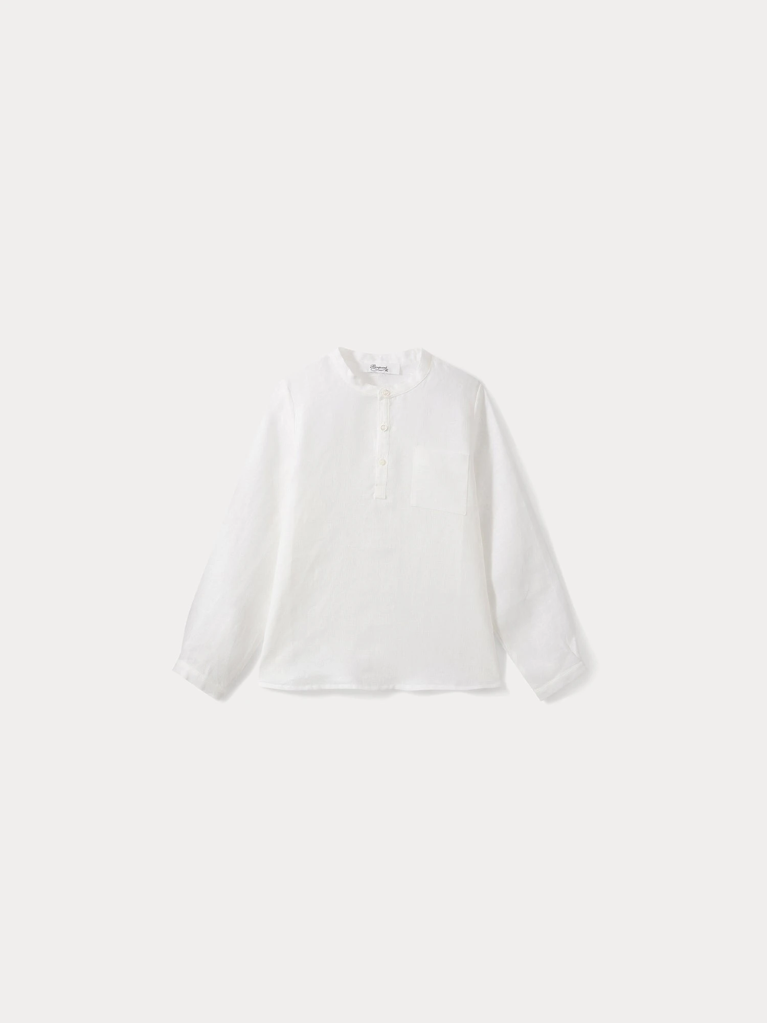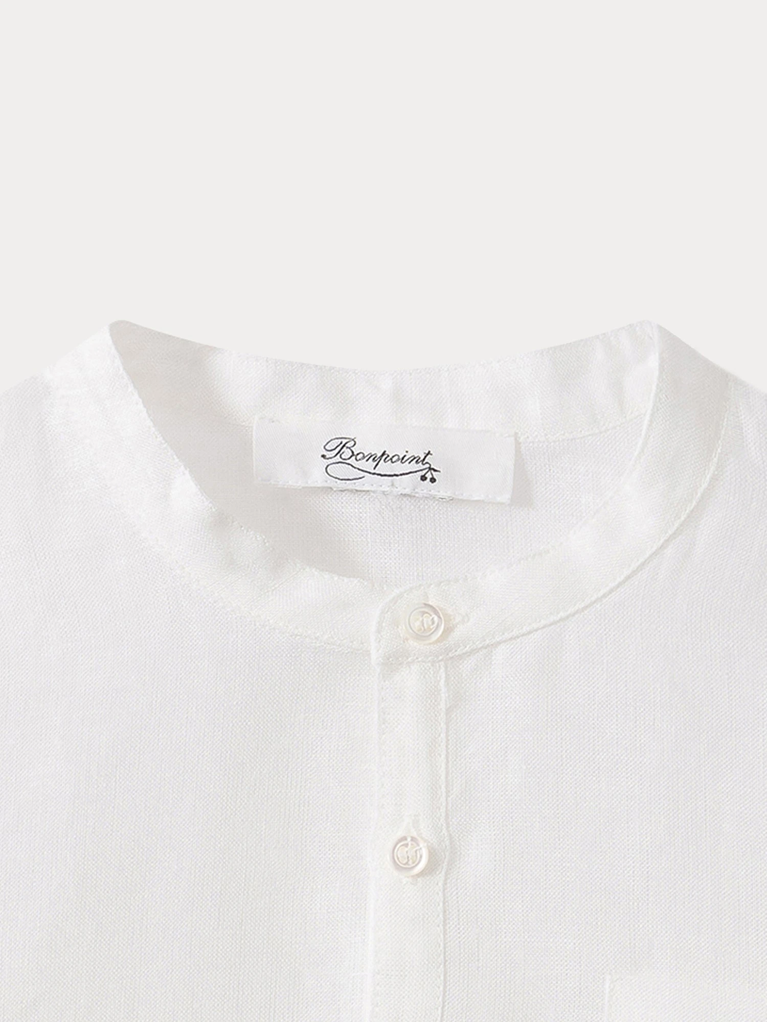 La tunique Artiste évoque aussi bien une chemise asiatique qu’une blouse de peintre. En lin blanc, elle possède un col tunisien, des manches boutonnées aux poignets et une poche plaquée sur la poitrine. Pour une tenue épurée, combinez-la à un pantalon chino uni.