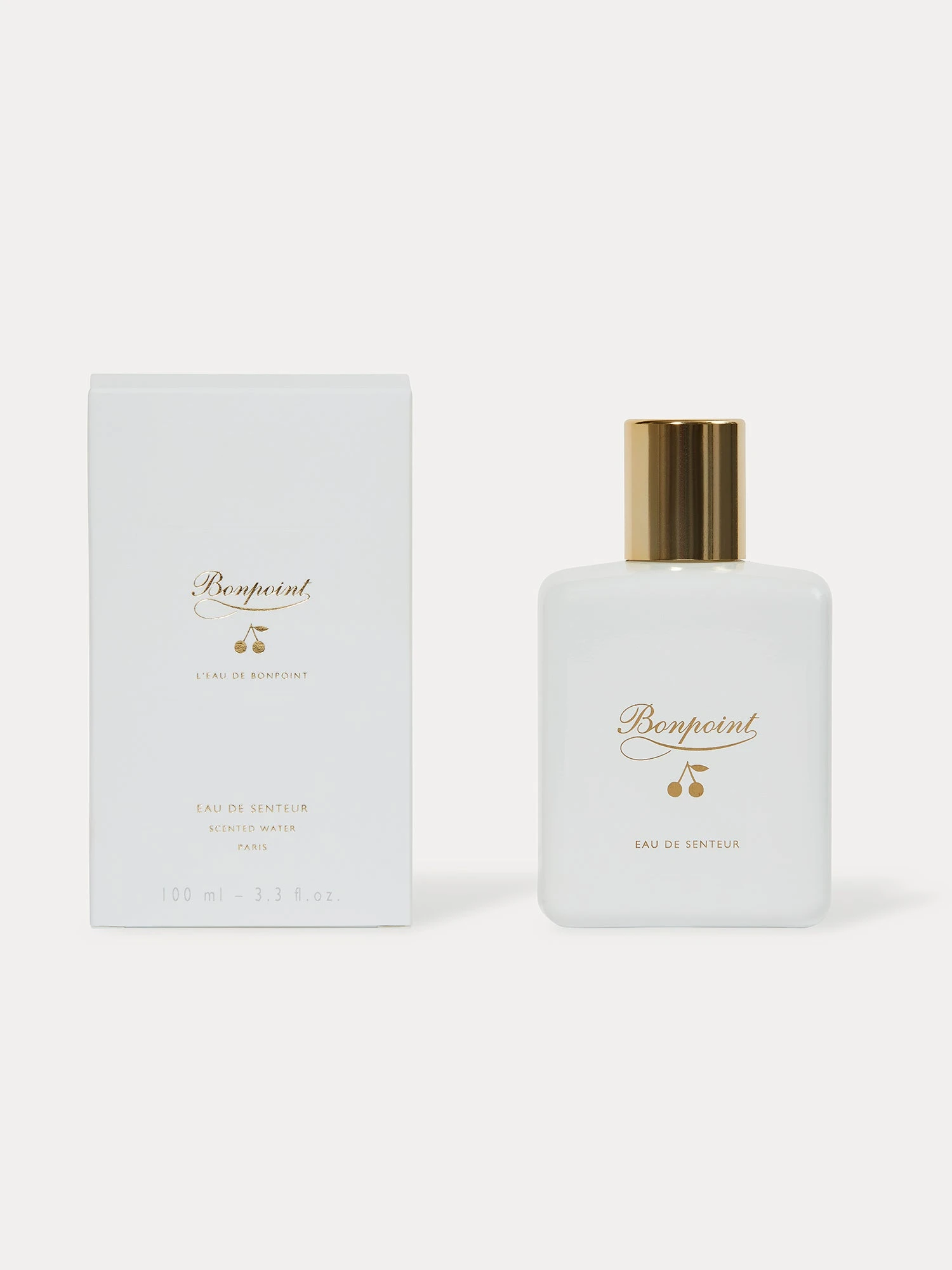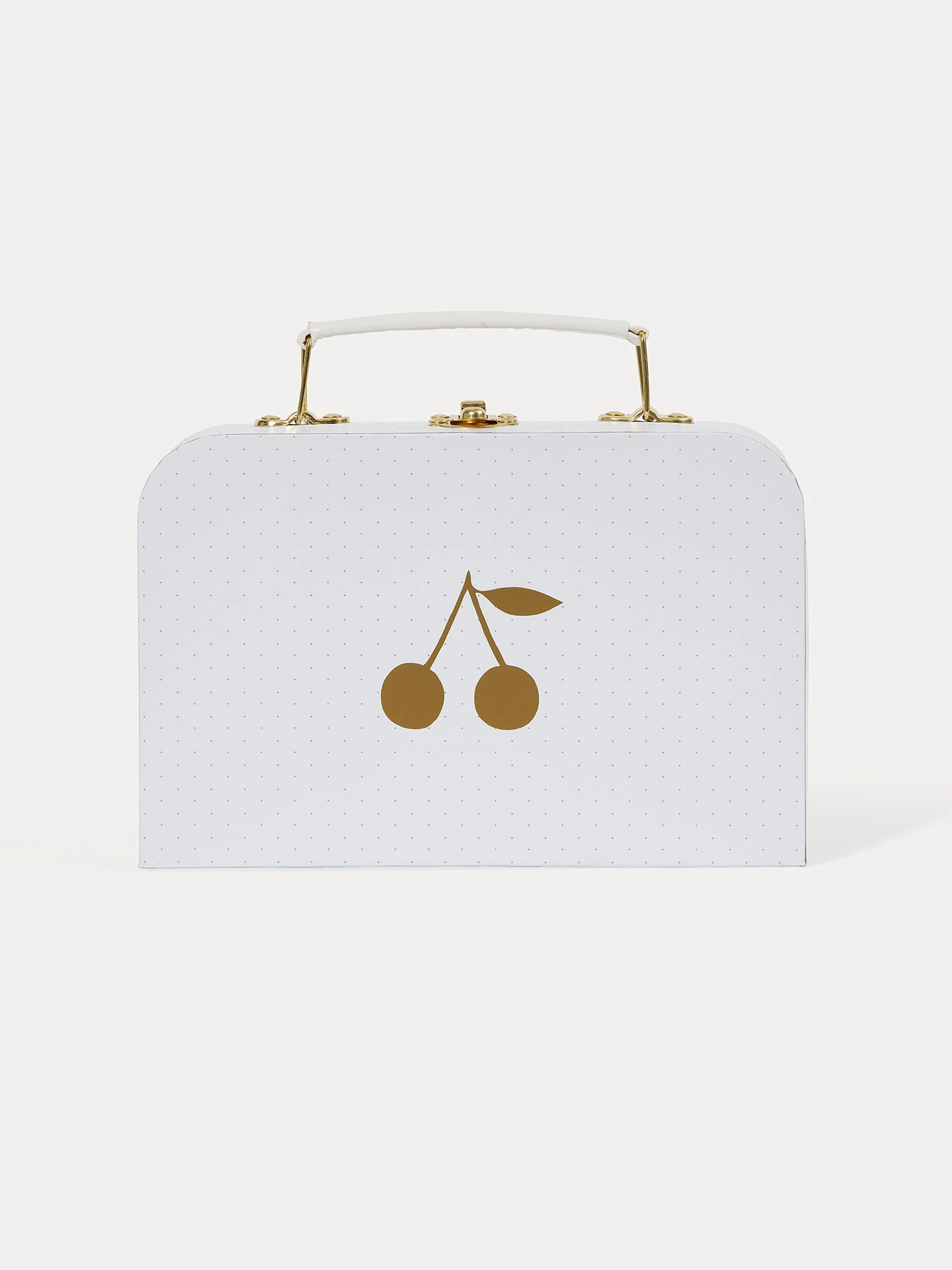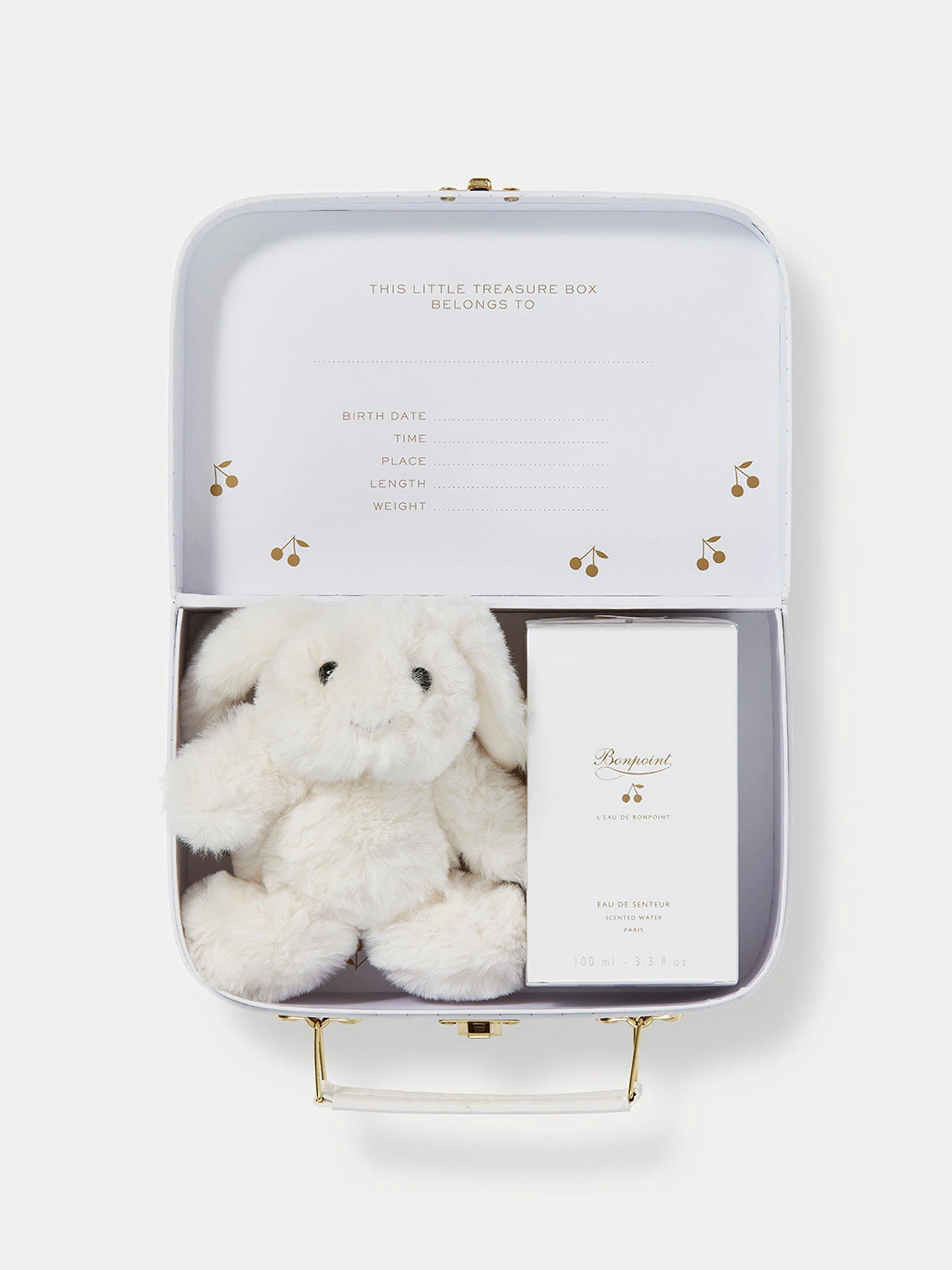 Dans cette valisette naissance, parée de délicats pois dorés, retrouvez l’iconique Eau de Senteur Bonpoint dans son flacon laqué blanc aux côtés d’un petit lapin blanc.