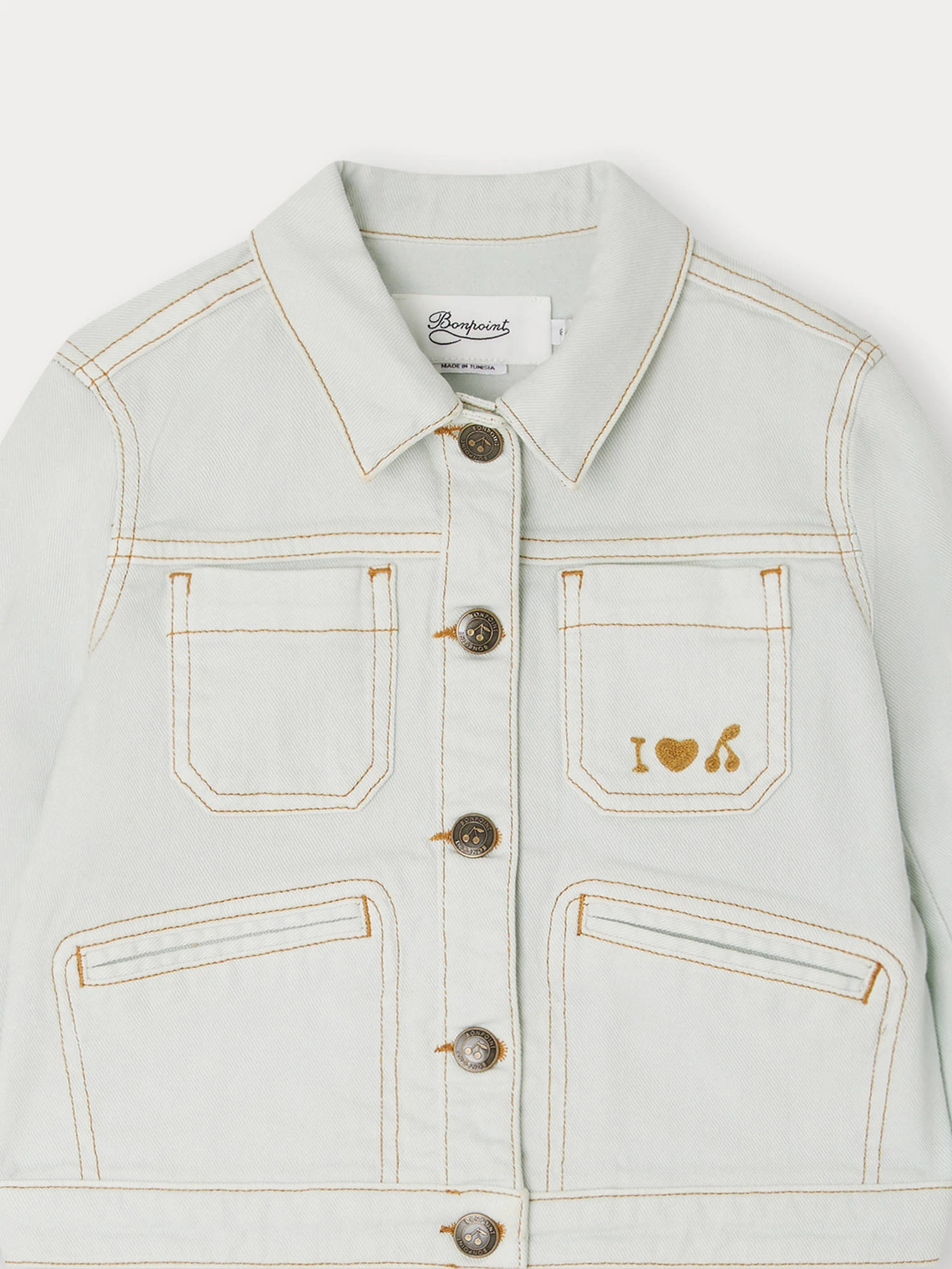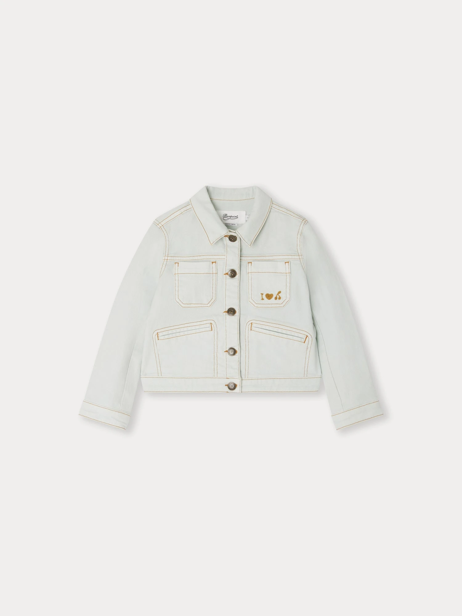 En jean, cette veste 4 poches Cassidy pour fille s’orne d’une broderie « I love Bonpoint » sur la poitrine. Des boutons griffés et un jacron en cuir signent le modèle.